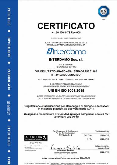 Interdamo s.r.l. è certificata UNI EN ISO 9001:2008 con l'ente TÜV Italia, per la “Progettazione e fabbricazione per stampaggio di siringhe e accessori in materiale plastico, ad uso veterinario”.